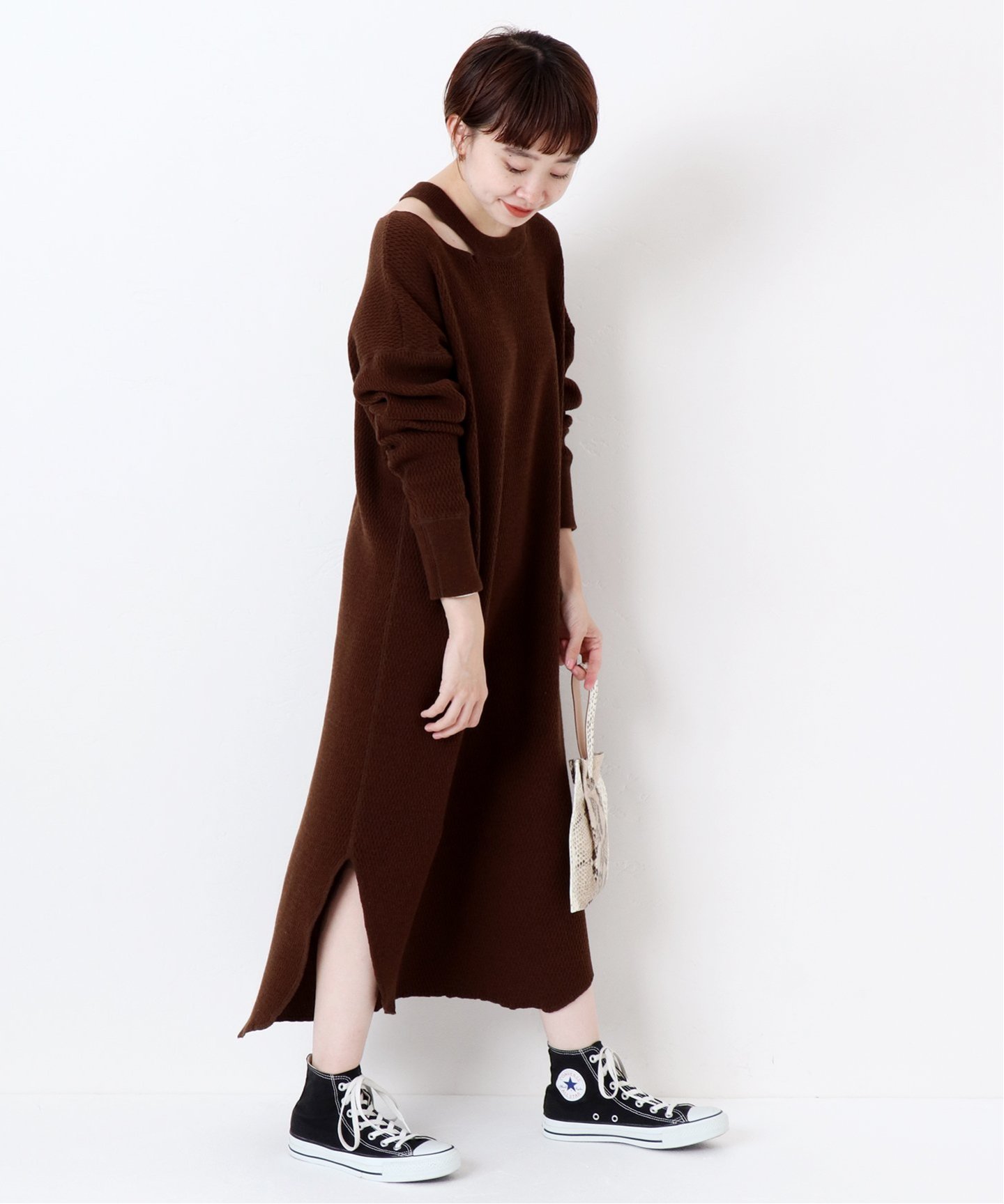 可以快速完成造型的 ONE-piece 是秋冬偷懶穿搭的好夥伴。未免少了造型感,不妨就挑選剪裁特殊的設計單品,若是有開岔設計時再搭配上高筒帆布鞋就能為整體提升聚焦效果。