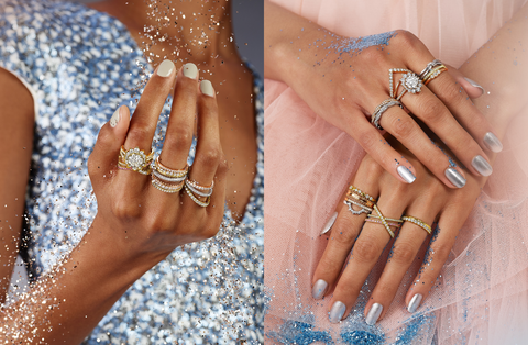 時尚從來就沒有搭配準則,但女性在穿戴戒指時卻很有默契地偏向保守,今年HEARTS ON FIRE聯合了美國婚紗天后Hayley Paige,將Hayley Paige經典的婚紗元素重現於戒指中,一是將屬於婚紗的浪漫基因轉換呈現形式、永伴女性左右,二則是讓戒指可以脫離傳統婚戒的穿搭框架,或許你也可以模仿層層紗布與蕾絲推疊出浪漫裙擺般,試著將戒指層疊混搭,挖掘出更多搭配的樂趣!