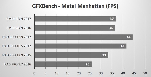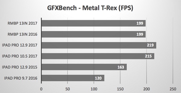 而在專門測試圖形性能的 GFXBench 測試中,不管是 T-Rex 場景還是「曼哈頓」場景,2017 款 iPad Pro 12.9 穩居第一,iPad Pro 10.5 緊隨其後,兩款 MacBook Pro 均明顯落在了後面。