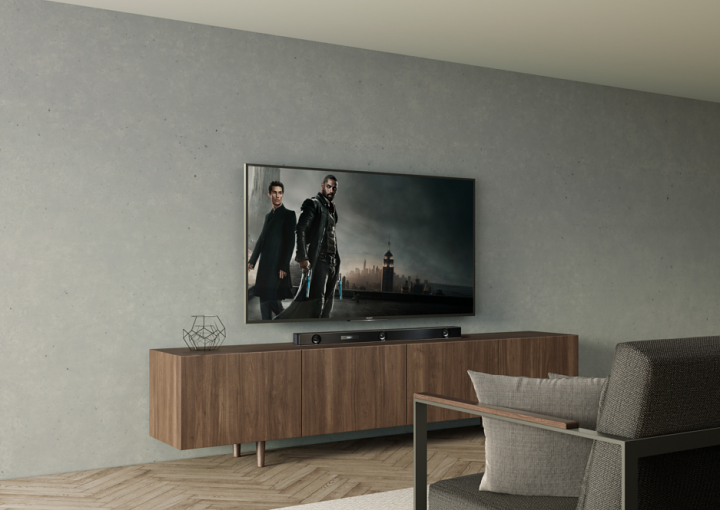 ▲ Sony HT-X9000F 單件式環繞音的斜角機身設計與 2018 BRAVIA 液晶電視 F 系列相符,可更貼合電視腳座。