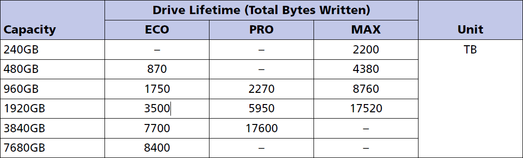 ▲5200 ECO、PRO、MAX 各系列與各容量 TBW 寫入壽命資訊,可以預計 ION 系列將比此數據更低。
