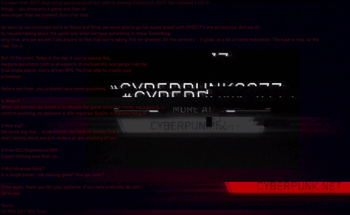 接著,若是將預告片最後閃動的畫面定格,同時進行色彩與對比度的調整,就會發現藏著一篇文字,內容大意是 CD Projekt Red 對期待《電馭叛客2077》的玩家感到十分抱歉,因為他們為了完善《巫師3:狂獵》而推遲了《電馭叛客2077》的遊戲開發,同時文章中也告訴玩家《電馭叛客2077》的 DLC 將全部免費,同時不會有 DRM 和微交易系統,但是遊戲規模及上市日期,仍然無法透露。