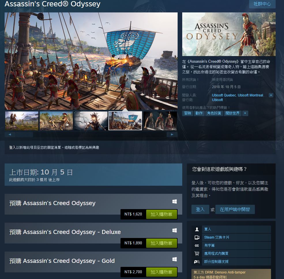 《刺客教條:奧德賽》將發佈於 PC、XBOX ONE 與 PS4 三個主要平台,而在 STEAM 等網路商店也已經開放預購,玩家準備掏出魔法小卡了,沉浸於古希臘的世界吧!
