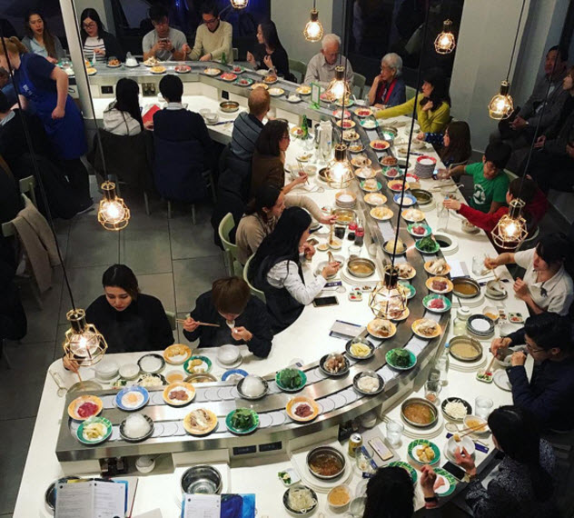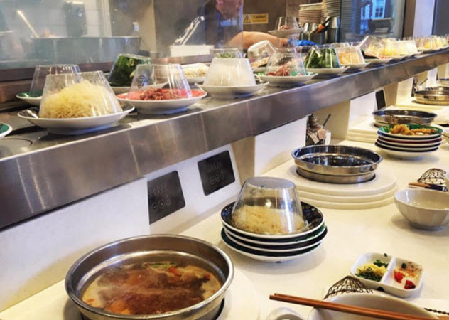 這家店的特點就是迴轉!大家還記得在台灣紅極一時的迴轉壽司嗎?只是這邊轉的是食材,食材會在軌道運轉看喜歡的就自請取下,餐點的價格就依照盤子的顏色區分,讓人一目了然,心裡有個底不怕超出預算,衛生起見每個盤子都會有透明蓋子,上頭還特別標記烹煮時間,真是貼心的設計。