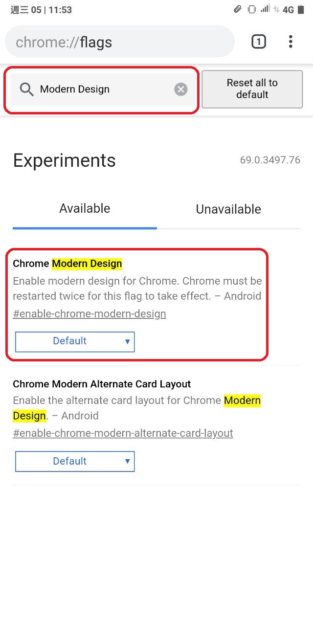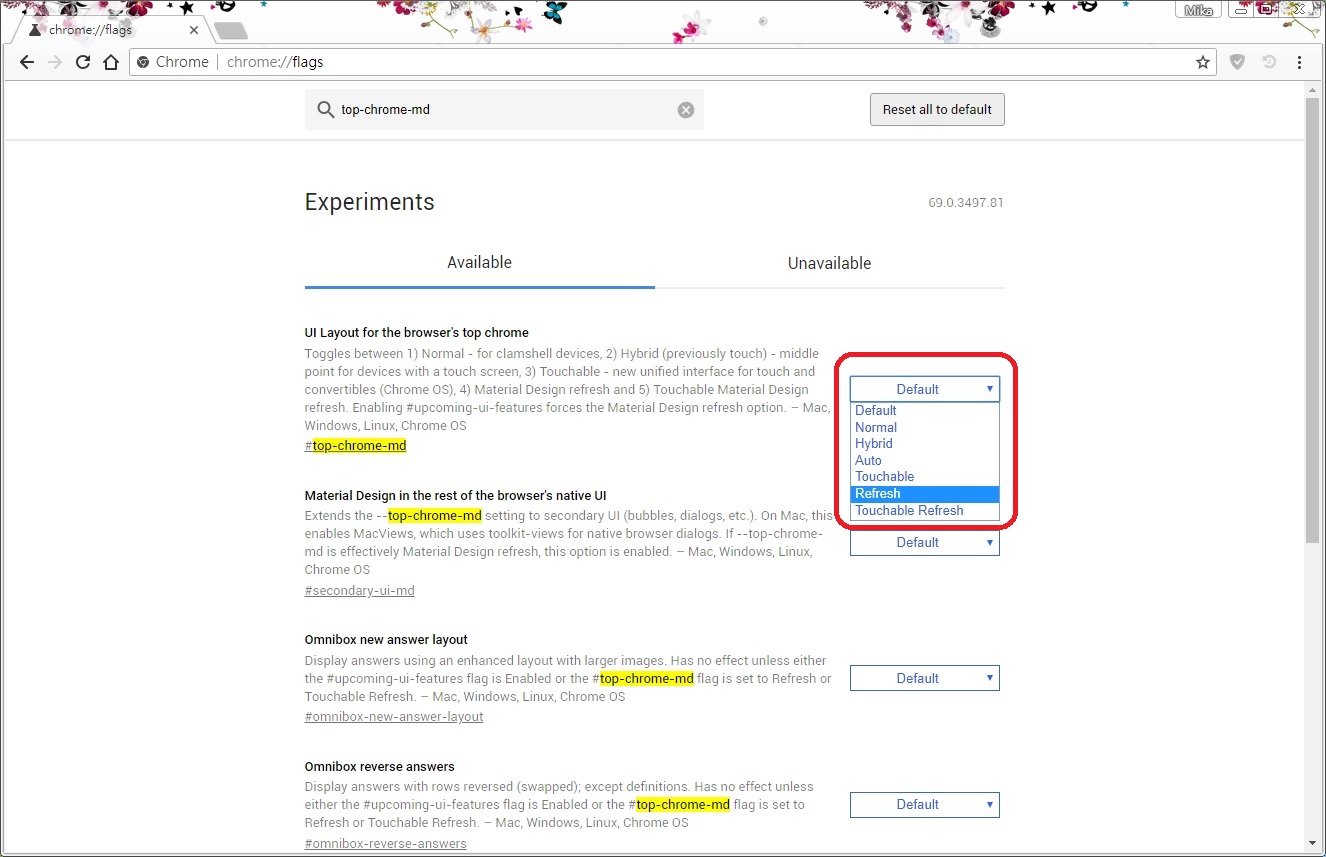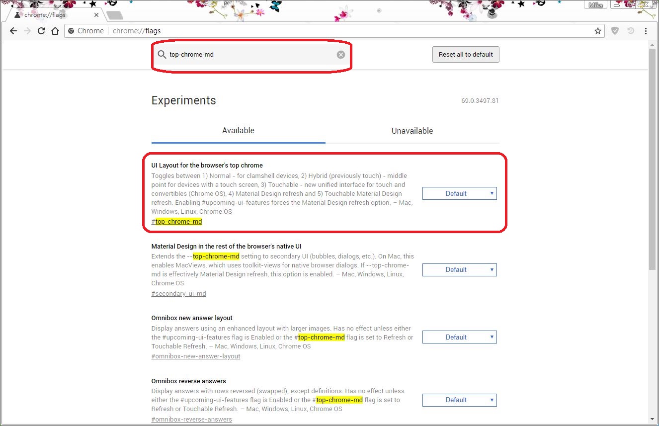 2.在搜尋框打上「top-chrome-md」,並找到「UI Layout for the browser's top chrome」的選項。
