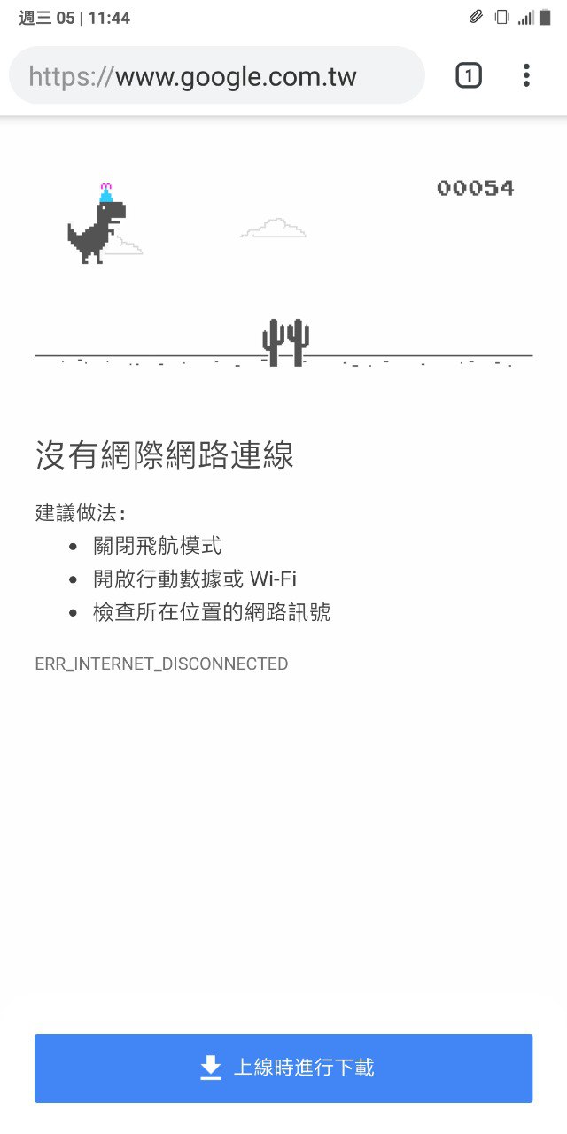 要玩到生日版的斷線小恐龍,首先裝置必須要中斷網路,開啟任意網頁後出現以下畫面。