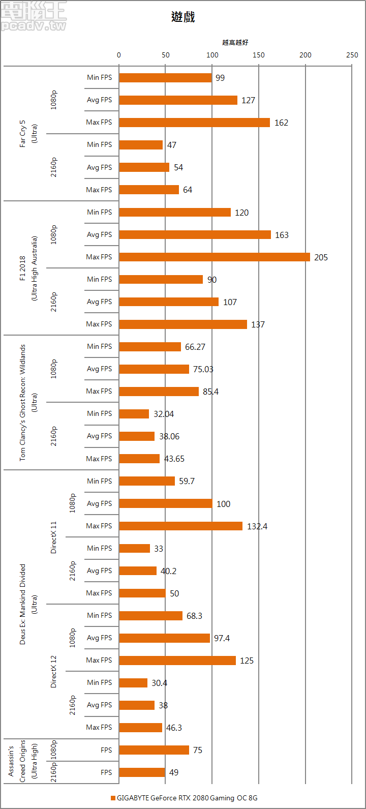 散熱佳帶動高時脈,高時脈連帶影響整體效能,環環相扣的結果,這款產品相較 Founders Edition 表現更好。3DMark 繪圖子項目分數,多項進步幅度可達 2%~2.5%,遊戲方面的表現也是如此,畫面內容較簡單的 F1 2018,4K 超高畫質設定平均超過 60FPS,Far Cry 5 畫面表現不錯,4K 極高設定平均也有 54FPS。