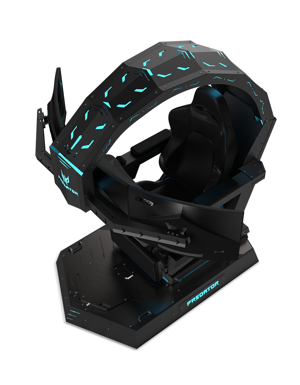 Acer Predator Thronos電競座艙可說是再升級的電競椅,外型上是以鋼骨設計的結構配上 LED 藍光,並採用符合人體工學座椅與腳踏板設計,以及能傾斜多達 140 度的座艙,讓玩家可依需求自行調整角度。在 Acer Predator Thronos電競座艙裡,於頂部的支架能固定多達三台 27 吋電競螢幕,還有空間放置一台 Predator 電競主機,再搭配其他 Predator 耳機、鍵盤、滑鼠…等配件,就組合成為電競打造的電競座艙,玩家在座艙內能夠隨著遊戲效果產生的高強度衝擊和震動,感受更真實的遊戲臨場感。而 Acer 在雙 11 活動期間,推出全球首波預購活動,售價 299,000 元,目前限量三台,消費者可至於 PChome 24h 購物網站上進行預購。