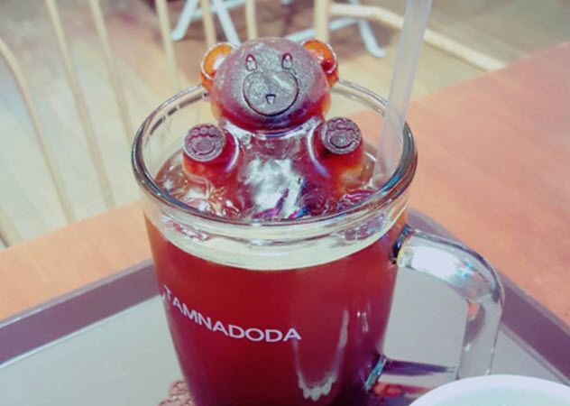 韓國的Tamnadoda就把腦筋動到冰塊上,研發出超萌的熊熊咖啡冰塊,只要你點一杯冰美式咖啡就可以看見一隻熊熊愜意的躺在杯中,這樣一杯咖啡售價為3500韓元,大約新台幣98元,價位雖然有點偏高,但是偶爾讓咖啡熊療癒一下也不過分啦~