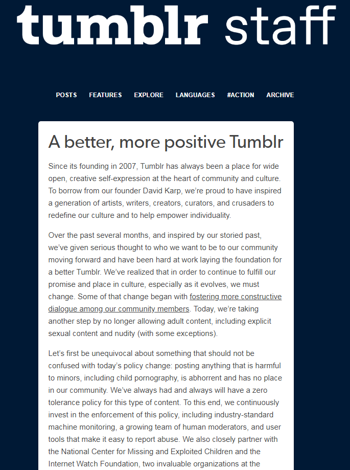 Jeff D’Onofrio 首先指出,Tumblr 自 2007 年創立以來,始終堅持的價值即是開放,但對於兒童色情一向的態度都是堅決反對且採取零容忍政策,甚至持續投資人工、機器過濾機制,禁止這類內容。但對於其他的成人內容,Tumblr 則不反對它們在部落格上出現。