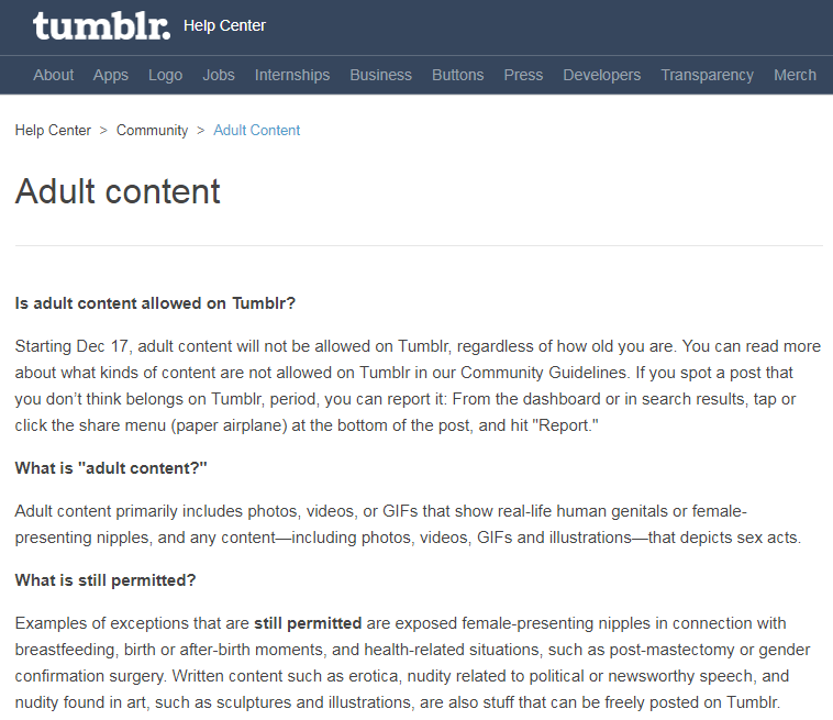 過多未經審核的成人內容導致 Tumblr 逐漸走向失控與極端化,而官方終於決定出手解決這個問題,那就是即將在 12 月 17 日全面刪除 Tumblr 上的所有情色媒體,並已將先前標註為成人內容的照片及影片(不含純文字文章),改為僅有湯主個人才能檢視,且鼓勵所有用戶對情色內容進行標記,以便在日後刪除,還給 Tumblr 乾淨與清新。