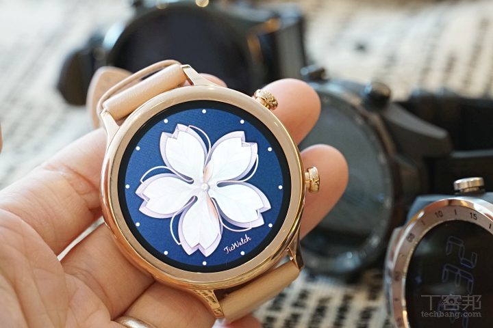 如果覺得 TicWatch Pro 稍嫌陽剛的話,還有 TicWatch C2 智慧手錶,一樣具備 IP68 防塵防水,錶身有遂空黑、星光銀、莫蘭迪粉多變的顏色,且搭配頗有質感的真皮錶帶,大尺寸版可和 20mm 的錶帶替換,小尺寸版則可替換市售 18mm 的錶帶。
