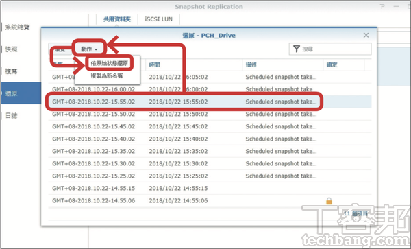 ▲ 6.在跳出的列表視窗中,選擇其中一個快照按下「動作」,並點選「依原始狀態還原」並「確定」,便可將該資料夾回覆到當時的狀態。