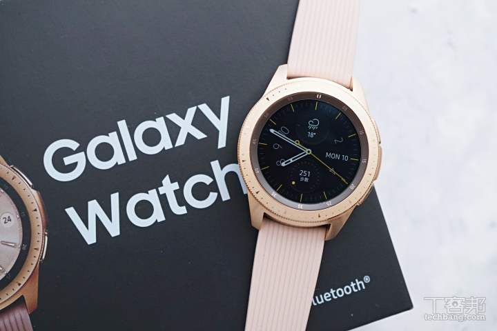 今年的 Galaxy Watch 不像前兩年的三星智慧錶一般走粗獷風格,而是推出了 42mm 和 46mm 兩種不同錶盤尺寸讓使用者選擇,皆支援 IP68 防塵防水規格。我們借來的是相對比較適合一般女性佩戴的 Galaxy Watch 42mm 玫瑰金版本,戴起來十分舒適合手,雖說連接錶帶的那個部件還是會略超過筆者手腕(手腕直徑約為 4.5cm),不過至少他能穩穩的貼合手腕,不會因為太大而覺得重心奇怪,或是大到穿長袖時覺得卡卡的不舒服。