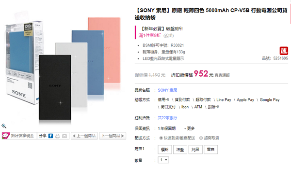由於台日的包裝不一樣,上圖也查不到型號,不過在台灣的購物網站查,目前Sony 5000mAh的行動電源還要952元,幾乎是兩折甚至一折的價格呢!