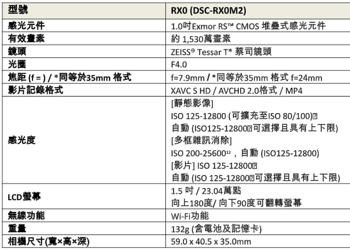 Sony RX0 II 完整規格表