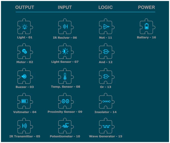 目前ActivePuzzle總共具有19種功能不同的積木,輸入端積木具有紅外線接收、光線感應、溫度感應、距離感應、電位器等功能,可以用於感測外界環境的狀態,並透過AND、OR、NOT、導線、絕緣體、波形產生器、A2D轉換器等邏輯運算積木「撰寫」程式,最後再將結果輸出至燈泡、馬達、蜂鳴器、電壓表、紅外線發射等輸出端積木,與外界互動。