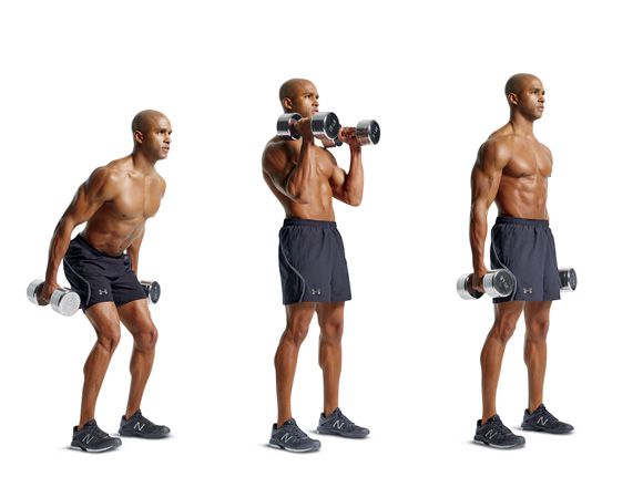 如何做:膝蓋微彎,屁股向後,雙手拿啞鈴置於膝蓋水平做準備。接著向前推臀部時,利用瞬間爆炸性的力量,將啞鈴向上拉至肩膀處抓住,最後再回到起始位置。