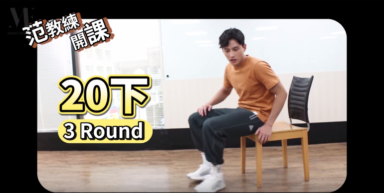 若想要加重訓練,他會改把腳抬高,以手伏地,腳尖撐在椅子上的方式進行伏地挺身的動作,約莫8下一組,共4個循環。