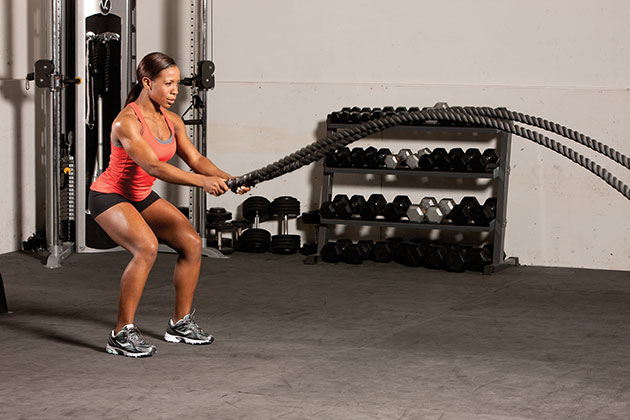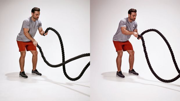 看似僅使用到雙手肌肉的戰繩,實際上在甩動中必須要用全身肌力來平衡繩子擺盪的力道(常見戰繩約13~15公斤重),不間斷的高強度運動也會使心跳急速上升,燃脂效果十分顯著。初次接觸的朋友,建議可以採間歇運動的方式進行:每個動作持續20~30秒後休息30秒,組數則依個人體能狀況安排。