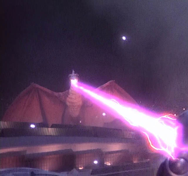 除了有三顆尖銳牙齒的龍頭外,王者基多拉另一個著名的攻擊方式就是從口中噴出閃電狀的「引力射線」,在預告片中也可以看到基多拉對著迎面飛來的摩斯拉正面顏射,編輯看了都快要坐不住啦!