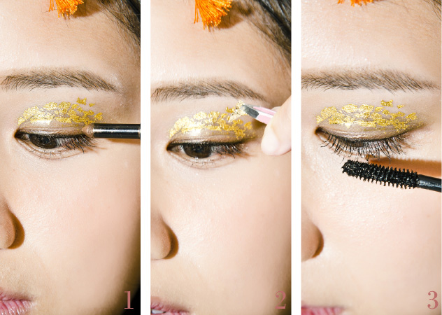 step2將少許乳液塗上上眼皮眼窩處,用鑷子將金箔一片一片黏上眼皮。