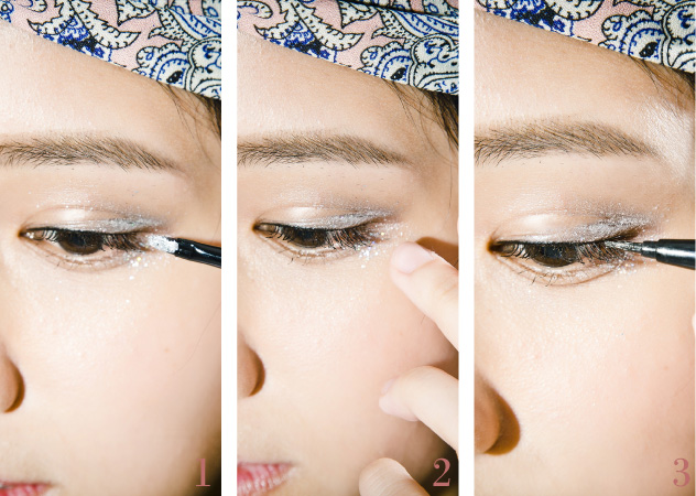 step1取適量帶亮片的銀色眼影,用較小的眼影刷具上在眼尾處,並微微拉長上揚。