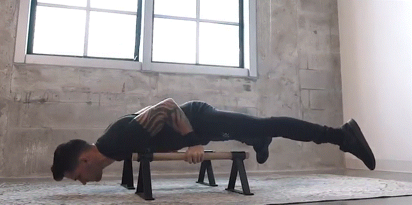 當你要進行這個動作時,建議可以去公園找個雙槓或是像下面動圖中使用伏地挺身輔助器,因為你會需要一定的高度來完成這個動作。注意在動作過程中,背部要維持與地面接近平行;當身體下降時注意手肘要超過肩膀的高度再將身體推起。