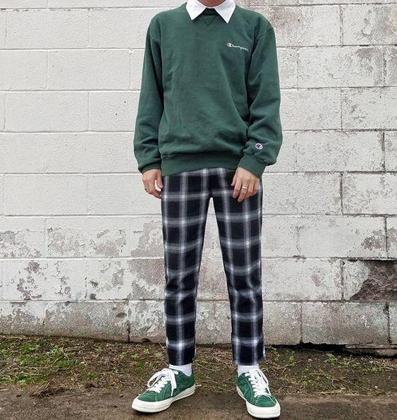 這種風格在日韓的街頭時常可見,重點聚焦於身上的綠色衛衣,搶眼又耐看,而下身的褲款可以選擇西裝褲材質的格紋褲,或是帶有破壞抽鬚的牛仔褲,因為大學T很百搭,所以基本上配什麼褲子都OK!如果你覺得這樣的穿搭太平淡,還可以加入褲鍊或項鍊等小飾品,為造型添色。