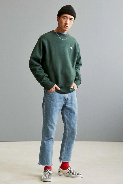 最後要介紹的穿搭提案難易度非常低,只需一件簡單俐落的大學T就能完成,即便是沒什麼預算的男大生也能輕鬆上手,利用超百搭的綠色大學T,與九分褲款搭配,再配上一雙別出心裁的彩襪與球鞋,既率性又休閒的造型,瞬間讓他人對你的好感度UP UP!