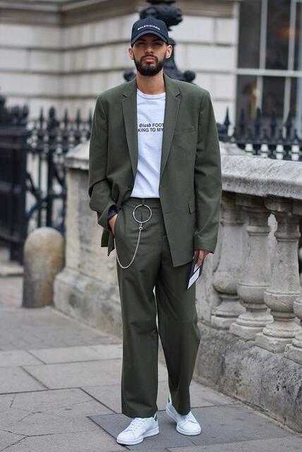 墨綠色的西裝給人一種沉著穩重的感覺,穿上後都會不自覺散發迷人的男性魅力,尤其是成套的綠色西裝,外套與褲子上下呼應,營造整體視覺的統一感,上衣可以內搭白T,越是簡單越能強調正裝的優雅。鞋子的部分則可搭配深棕色的牛津皮鞋或小白鞋,隨你的風格喜好而定。