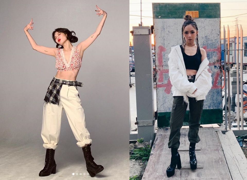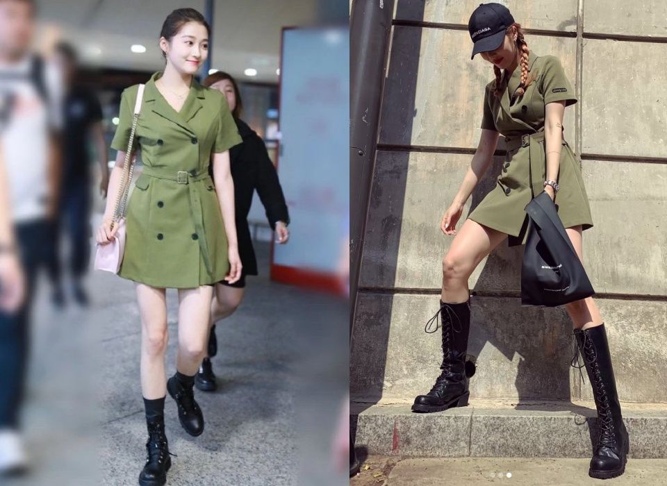 關曉彤和炫雅不約而同選了軍綠色的排釦洋裝。不過,炫雅的長筒馬丁靴更有氣勢,同時呼應了配件鴨舌帽和提包的黑色,讓整體穿搭更協調,街頭感也較多。