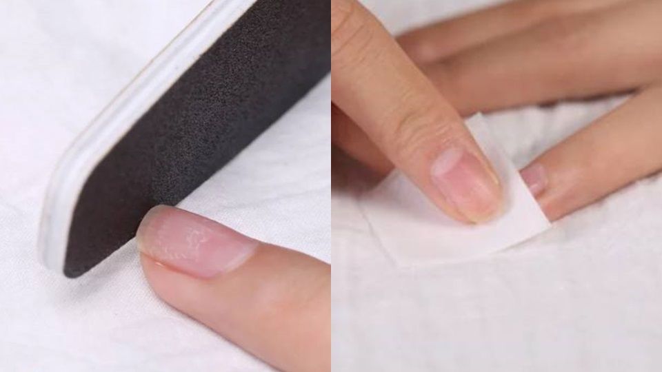 拿出摩砂棒磨掉指甲邊緣較尖銳、形狀不平整的地方~再用酒精將甲面清潔乾淨!讓甲型更漂亮,指甲油也能更持久~