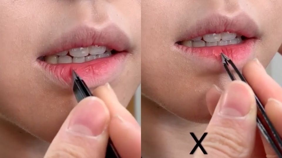 第一步就是要用鑷子先將黏在嘴唇上的死皮夾起來!不過這一步要注意,不要直接用鑷子拉扯死皮,或是將死皮撕下來,因為這樣只會讓唇部受傷,導致後續更難上妝,甚至完全無法上妝啊!