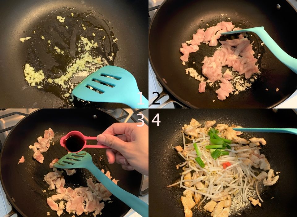 食譜:糙米飯 1cup、雞胸肉切成條狀 170g、酪梨油 1茶匙、豆芽菜 1把、淡醬油 半匙、蔥段&辣椒 少許、蒜末 適量