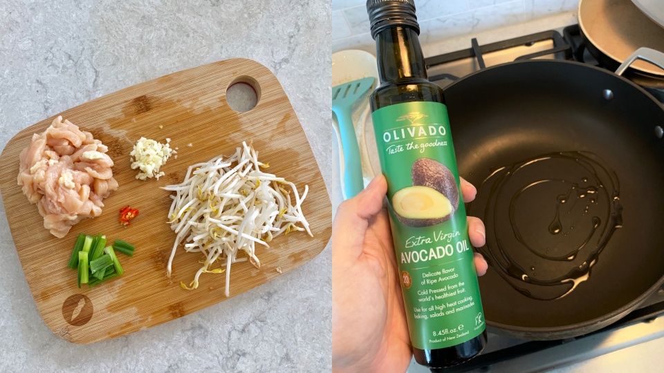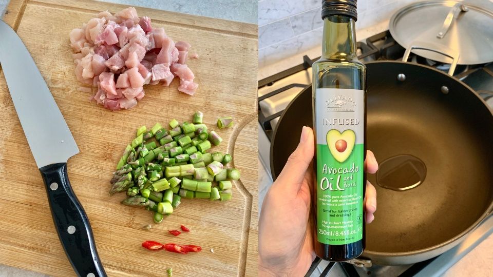 STEP1. 先把酪梨油倒入鍋中,開大火熱鍋。