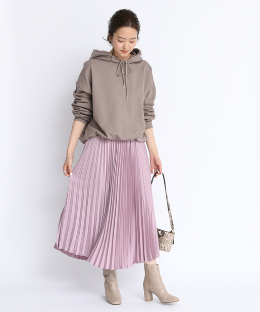 中長版的毛衣與光澤百褶裙相連出異材質拼接的服裝效果,全身利用一致的柔和色彩成功讓光澤單品躍身造型主角。