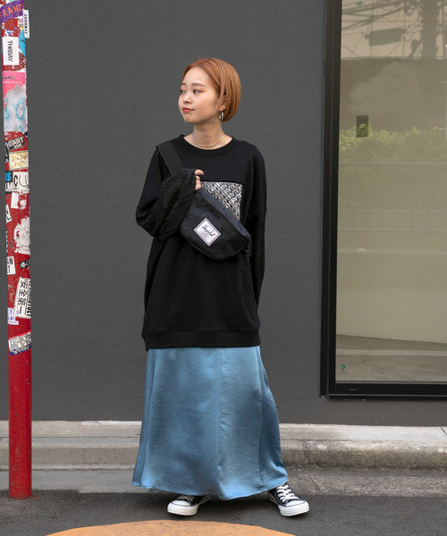長度落地的傘裙成功地修飾出美型的長腿效果,而帶有莊嚴感光澤裙選搭休閒風格的襯衫,成功地揉合出慵懶的時髦印象。