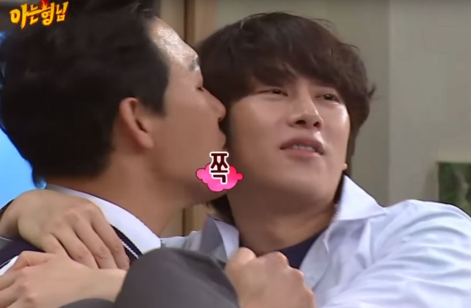 朴誠雄雖然長相硬漢,可是他每次都會莫名組起男男CP。之前朴誠雄和蔡貞安出演《認識的哥哥》,在Q&A環節中,由於金希澈成了答題王,第一名的獎勵是得到朴誠雄的kiss一枚。沒想到朴誠雄超大方的公主抱起金希澈,直接在金希澈臉頰上親了一口,簡直太可愛了~