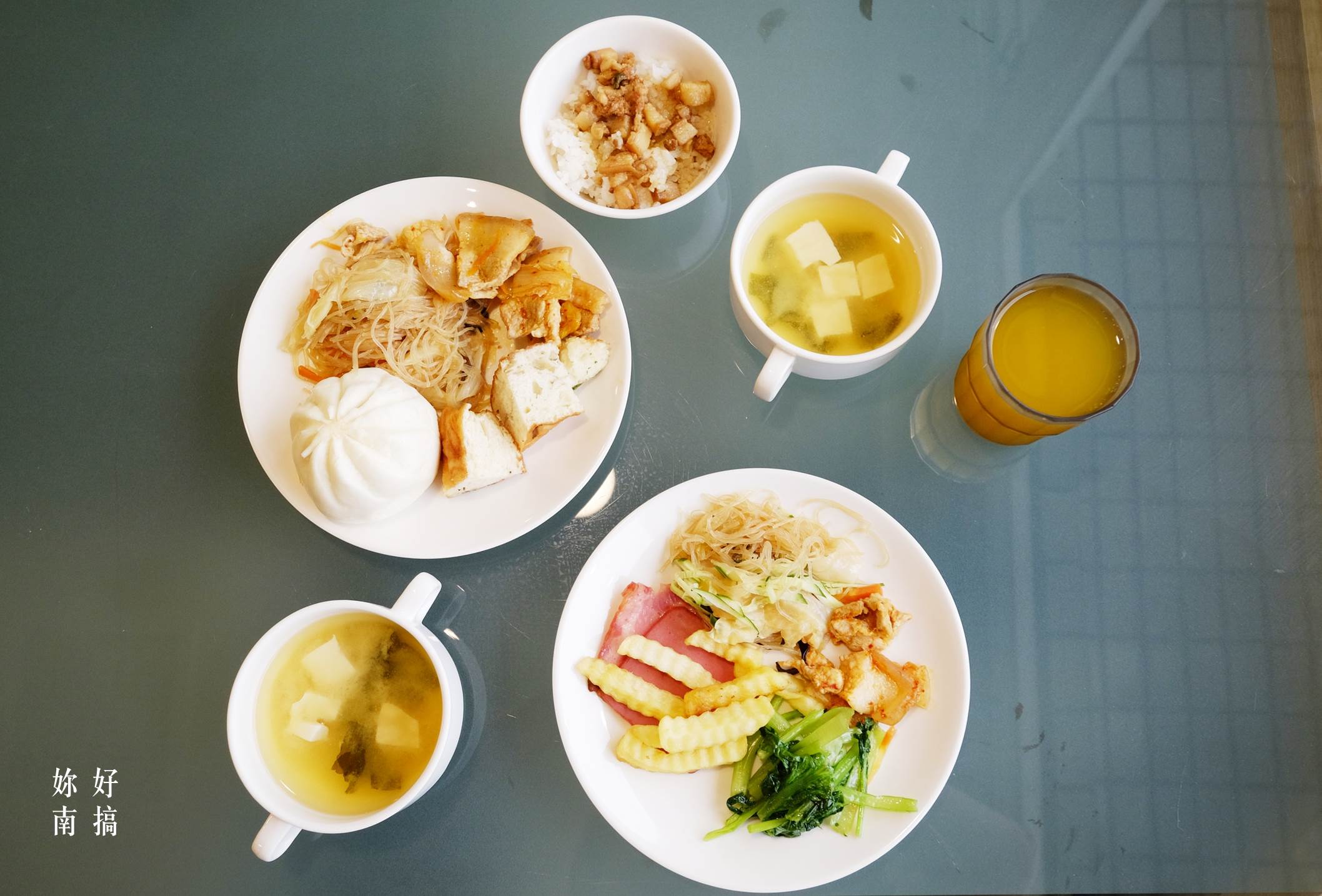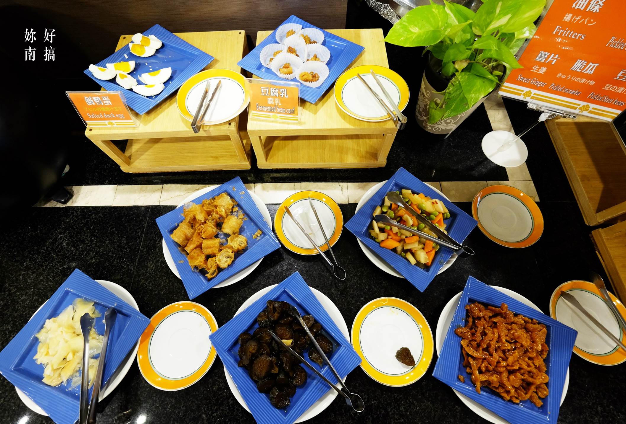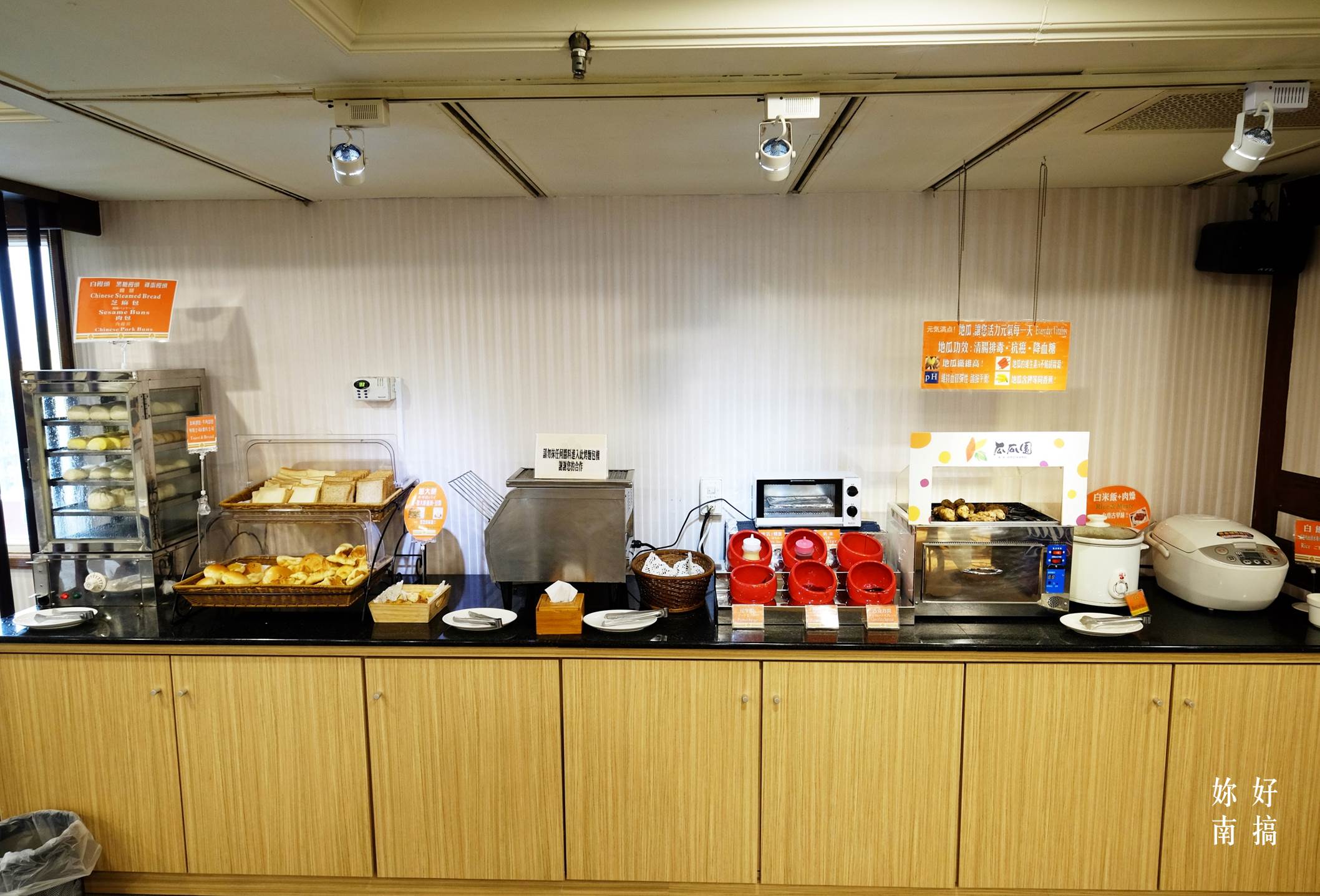 早餐菜色多樣豐富 , 葷素皆有提供 , 也有西式的麵包、沙拉吧、水果、現煎荷包蛋 ,