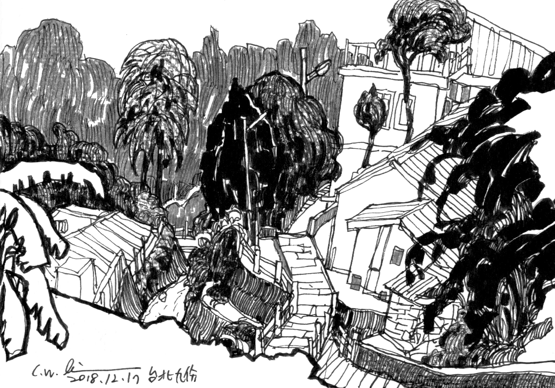 一大早我從民宿出發。大霧像薄薄的布幔,層層疊疊的遮住眼前的風景,也為這座山城增添了一股神秘的氛圍。走著走著,停下來,我找了一個可以倚靠身軀的地方,開始速寫。