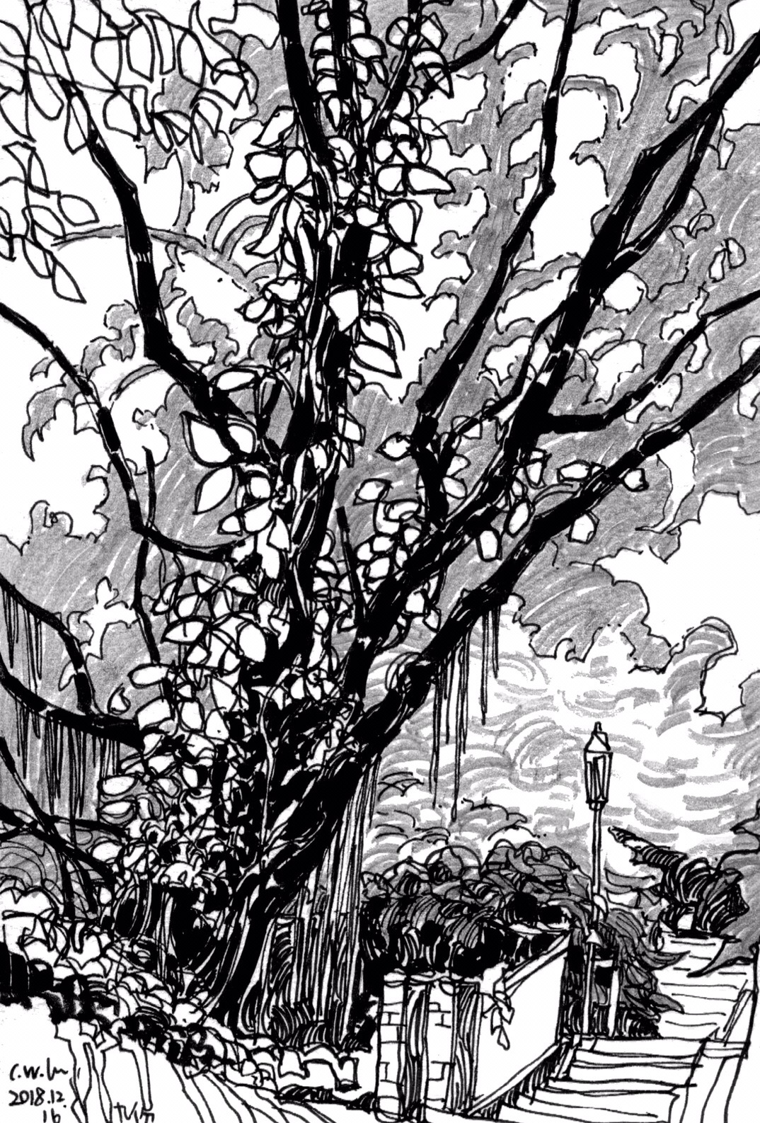 我步行在樹林裡的磚石步道,邊走邊探,小心蔓生的蘚苔。下到了河床,看了看,決定畫水彩好了!這也是這趟旅行中,唯一的一幅彩色速寫。我習慣在畫裡找尋「整體的形狀」,這是讓一幅畫能夠產生美感的主要原因。
