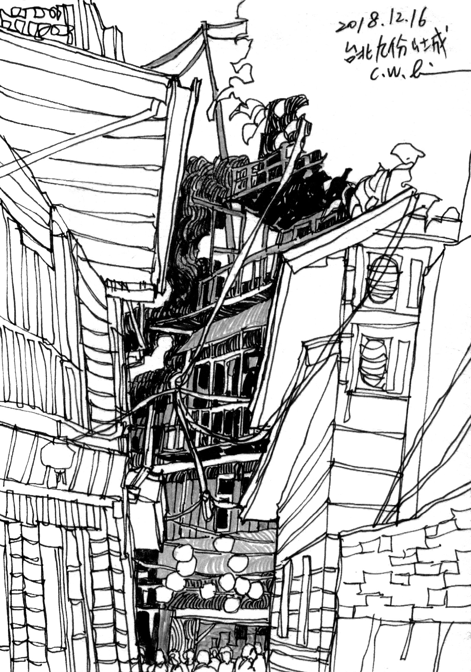 在九份老街,可以吸引我創作的地方,不是掛著玲瑯滿目商品或美食的店家,而是那一幕熱鬧的氛圍。於是,我決定這幅畫只畫線條就好了。這可不是我在偷懶喔,因為我不希望著色的色塊減弱了這幅畫裡人群擁擠的感覺。