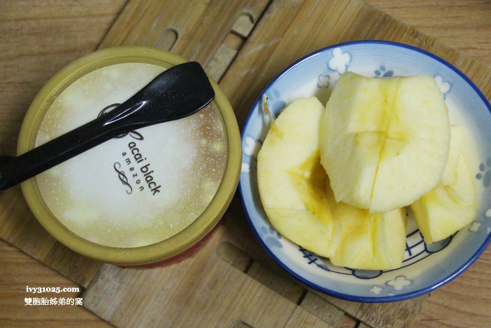 因為巴西莓冰沙吃起來已經帶點香蕉味道,所以我不想讓味道變得太多樣化和複雜,所以只添加新鮮蘋果下去搭配打果汁奶昔。