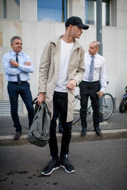 入門的長版風衣搭配推薦以白 TEE 混合,以卡其與白的配色技巧,為衣著傳達滿分的氣質魅力,隨性選搭黑色窄管長褲與球鞋,製造出簡約又深刻的風格,再背個後背包便能打造男孩感的率性印象。