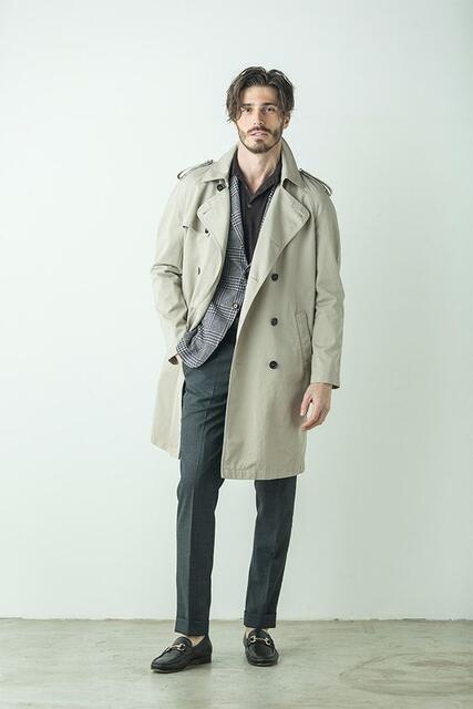 長版風衣最擅長表現的成熟氣息,除了單穿風衣外套之外,還可以透過內搭襯衫與西裝外套,來加強沈穩大人感的型男品味,尤其卡其色屬於非常好駕馭的顏色,不論與灰或格紋混合都很融洽,再加上西裝褲呈現注目十足的帥氣度。