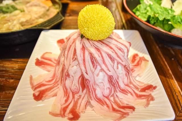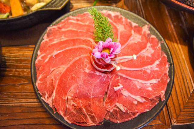 八豆食府壽喜燒肉品提供:梅花豬肉、鮮嫩去骨雞腿肉、手工成型雪花羊肉、美國優質牛肉、紐澳優質牛肉五種肉品選擇,光看這肉質和油花,就知道都是品質相當不錯的!連擺盤都這麼美~