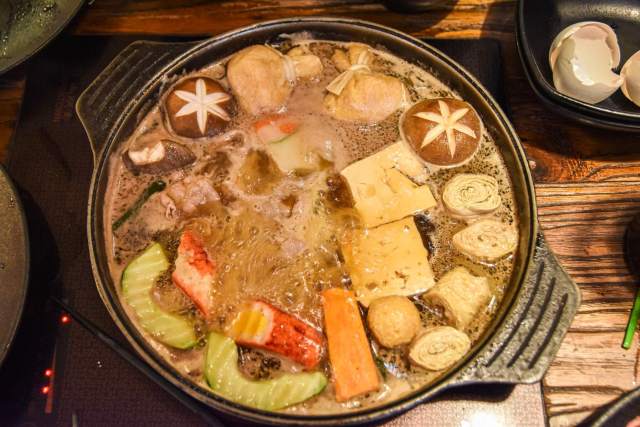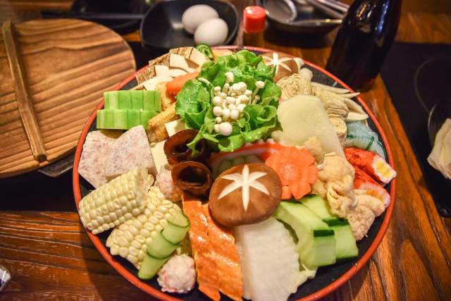 豪華菜盤裡有嚴選高麗菜、杏鮑菇、香菇、炙燒豆腐、腐皮卷、魚丸、黑木耳、紅蘿蔔、玉米、南瓜、絲瓜、芋頭….等35道精選時蔬,這道超營養的菜盤,上菜時讓我們大呼天啊~份量好大好營養,而且擺盤也相當用心
