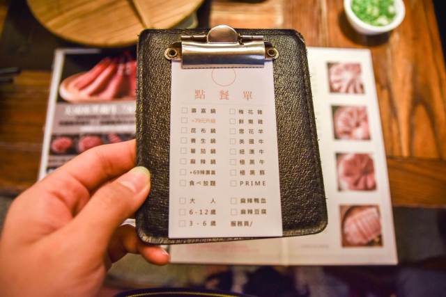 蔬菜類(高麗菜、空心菜、白菜、大陸妹、金針菇….)會以推車的方式固定巡場供應,看到什麼喜歡的就可以請服務生幫你夾,但還是夾取適當份量,不要浪費食物囉~肉類則是填單點餐喔!
