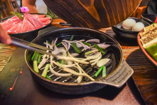 一開始服務人員會先來把青蔥和洋蔥用壽喜燒醬汁爆香,爆香完會有獨特的風味,類似石頭火鍋的感覺,第一次吃到這種口味的壽喜燒,很特別呢!